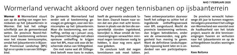Op de vergadering van de Provincie (12/5/2025) en die van de Gemeenteraad Wormerland (13/5/2025) zijn nogal wat verwarrende uitlatingen gedaan. Maar met de geëiste aanvullende voorwaarden zoals de landschappelijke inpassing van het gebouw en de padelbanen v.w.b. de open ruimte en vergezichten alsmede de habitat voor weidevogels, invloed van verlichting op landschap en op de fauna is het nog geen 'einde wedstrijd' Een 'tiebreak' moet zorgen voor een oplossing.