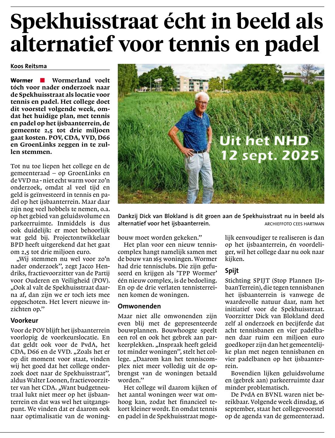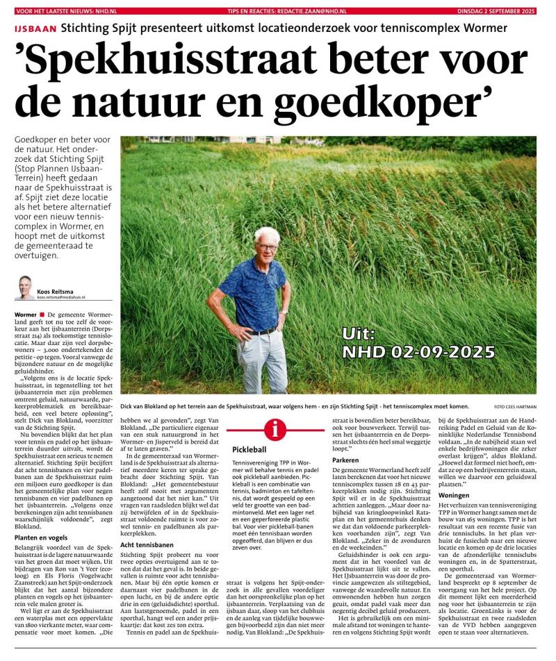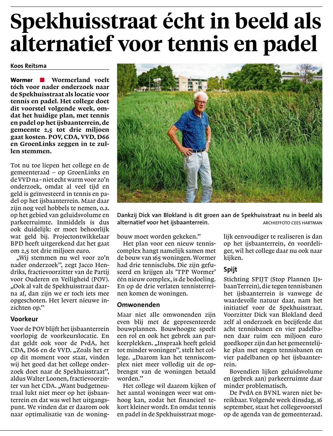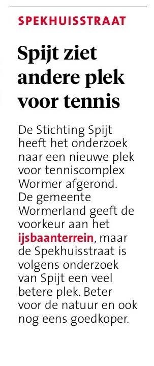 Stichting SPIJT heeft het onderzoek naar een nieuwe plek voor tenniscomplex Wormer afgerond. De Gemeente Wormerland geeft vooralsnog de voorkeur aan het IJsbaanterrein, maar een locatie aan de Spekhuisstraat is volgens onderzoek van SPIJT een veel betere plek.