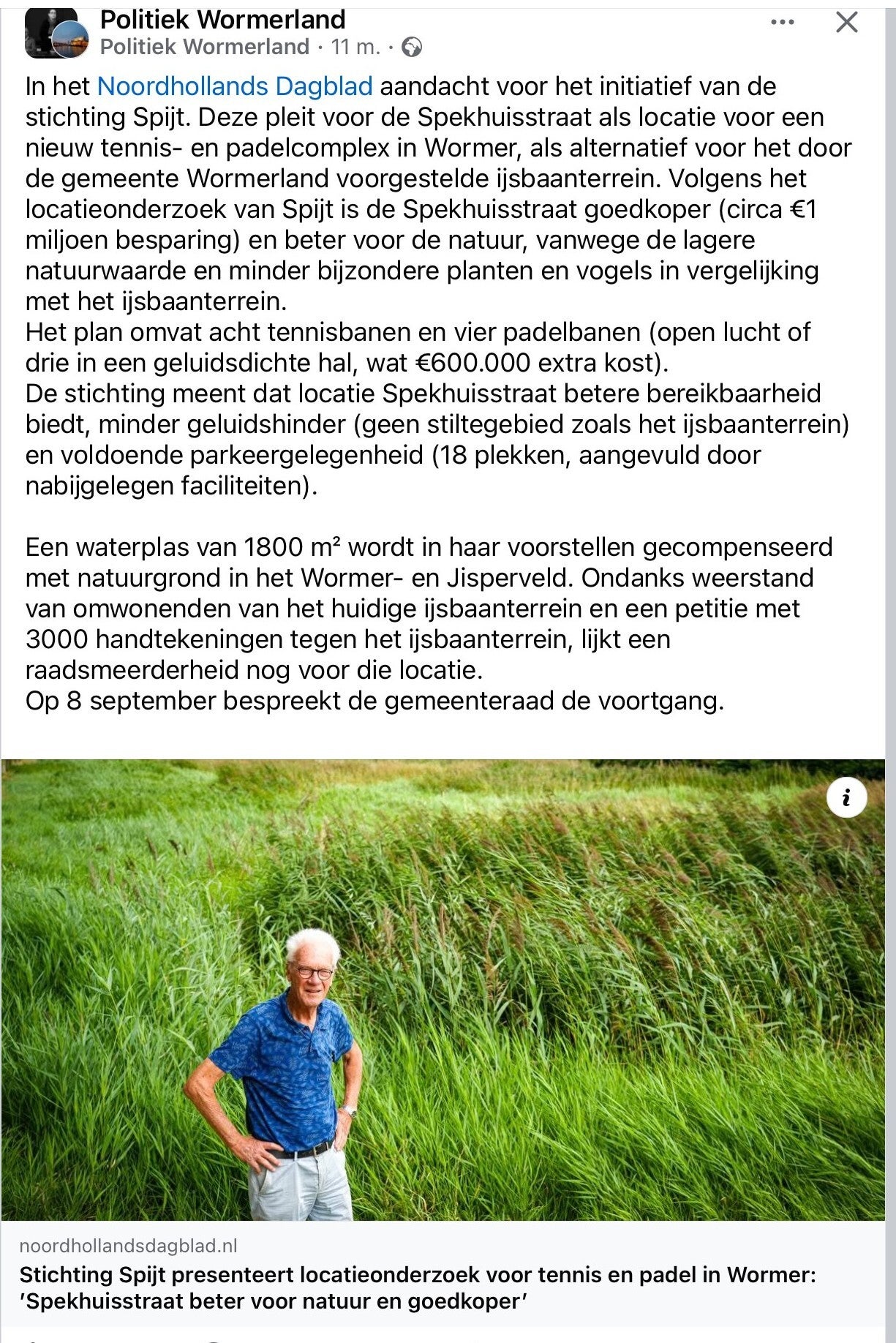 Men vergeet ook een aantal belangrijke speerpunten zoals de plaatsing van 4 padelbanen, een financiële onderbouwing, verkeers- afwikkeling en voert als argument aan dat het belangrijk is voor de woningbouw terwijl Wormerland ruimschoots voldoet aan haar verplichtingen door de enorme nieuwe woningbouw (1400 stuks) die er reeds is gepland. Kortom, de Pinokkio's in het Gemeentebestuur zijn weer driftig bezig om het zand in de ogen te strooien van de burgers.