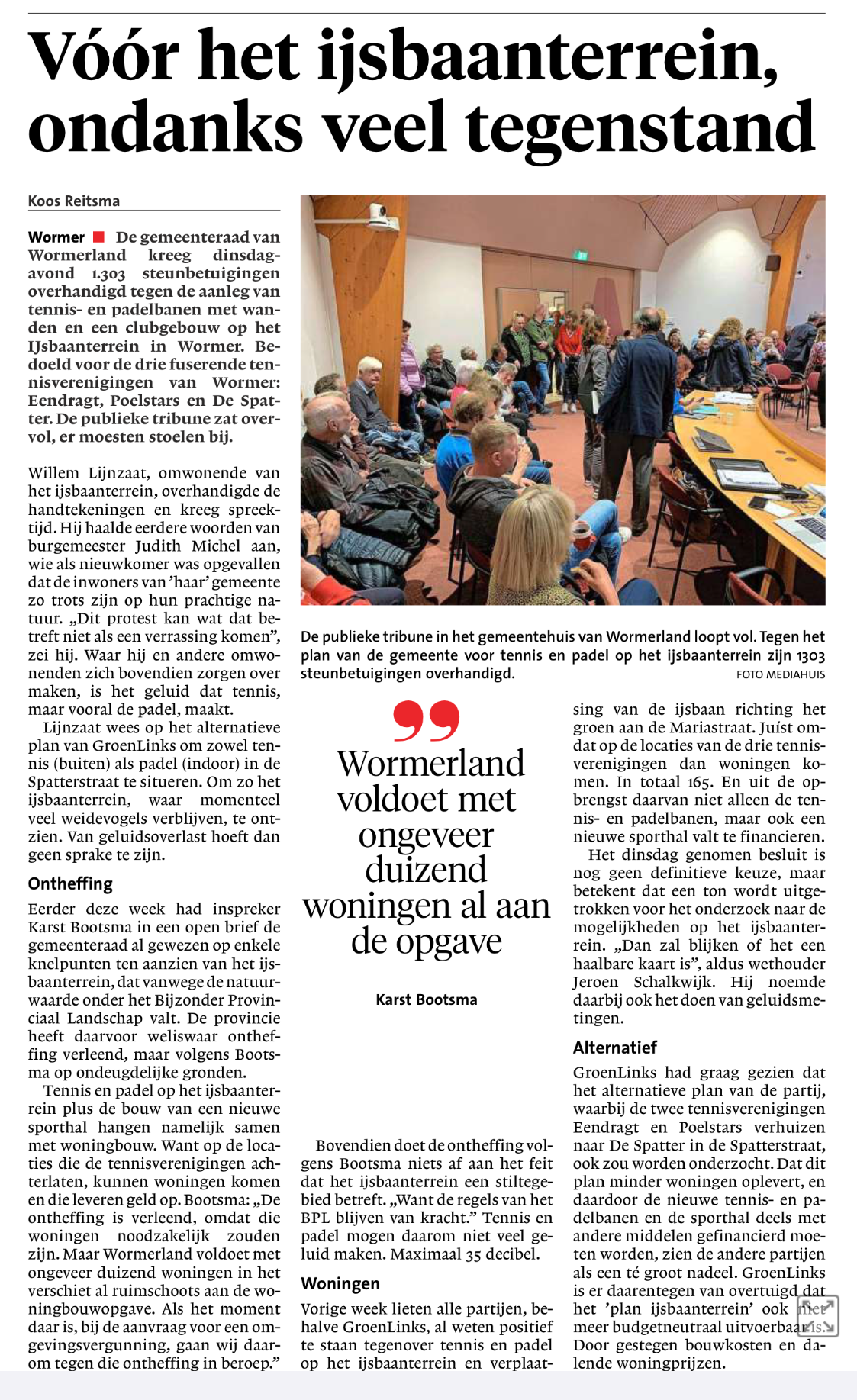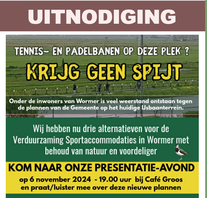 Na jarenlang, veelal in het geheim, plannen 'gesmeed' te hebben om een nieuwe sportaccommodatie te gaan bouwen op het IJsbaanterrein in Wormer, vond de Gemeente Wormerland het dan eindelijk tijd worden om de omwonenden en direct betrokken bewoners informatie te gaan verstrekken over de plannen van een nieuw sportcomplex in het natuurgebied (BPL) waar thans een natuurijsbaan is gevestigd. Een geweldig grote opkomst van buurtbewoners togen op dinsdagavond 29-11-2022 naar café Groos en waren benieuwd naar hetgeen de Gemeente van plan was en wat hen bezielde om de schitterende natuur in het Wormer- en Jisperveld geweld aan te doen om op die bijna 'heilige' plek een mega-tennispark aan te gaan leggen met maar liefst 10 tennisbanen en 4 padelbanen.