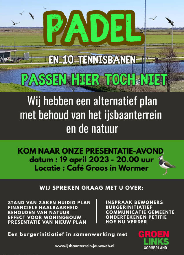 Na jarenlang, veelal in het geheim, plannen 'gesmeed' te hebben om een nieuwe sportaccommodatie te gaan bouwen op het IJsbaanterrein in Wormer, vond de Gemeente Wormerland het dan eindelijk tijd worden om de omwonenden en direct betrokken bewoners informatie te gaan verstrekken over de plannen van een nieuw sportcomplex in het natuurgebied (BPL) waar thans een natuurijsbaan is gevestigd. Een geweldig grote opkomst van buurtbewoners togen op dinsdagavond 29-11-2022 naar café Groos en waren benieuwd naar hetgeen de Gemeente van plan was en wat hen bezielde om de schitterende natuur in het Wormer- en Jisperveld geweld aan te doen om op die bijna 'heilige' plek een mega-tennispark aan te gaan leggen met maar liefst 10 tennisbanen en 4 padelbanen.