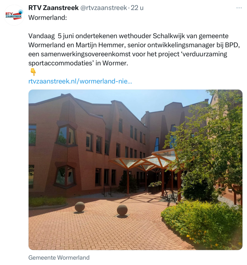 De Gemeente Wormerland onderzoekt momenteel de haalbaarheid van het project 'Verduurzaming Sportaccommodaties'. Het project bevindt zich momenteel nog in de onderzoeksfase. Hiertoe is de eerstvolgende stap om aan de hand van het uit te voeren haalbaarheidsonderzoek een Stedenbouw-kundig Programma van Eisen op te stellen (SPvE).