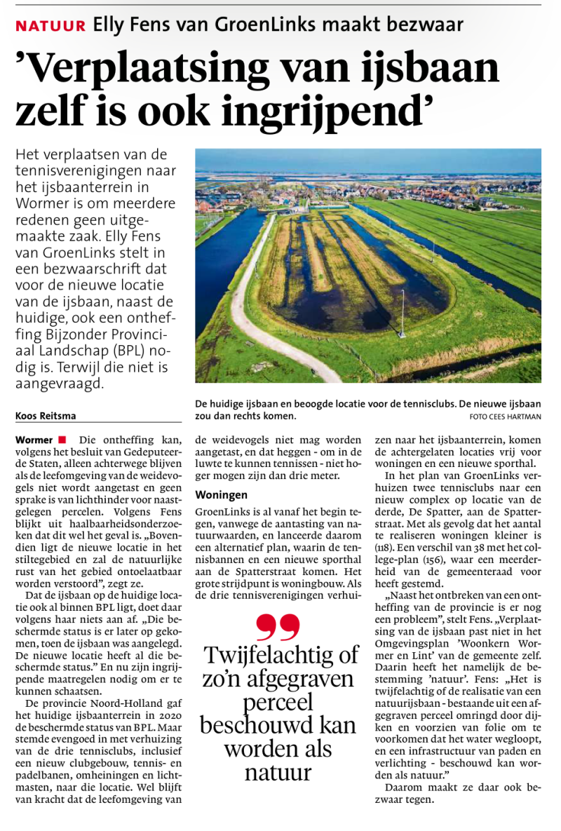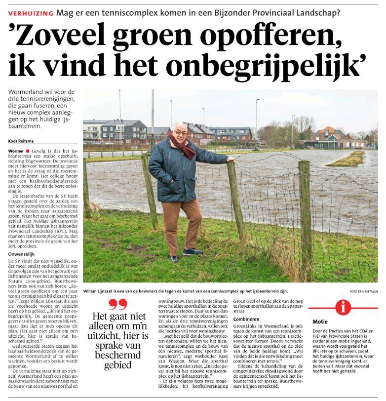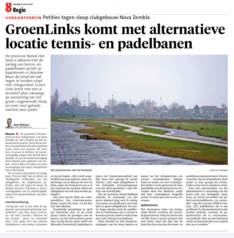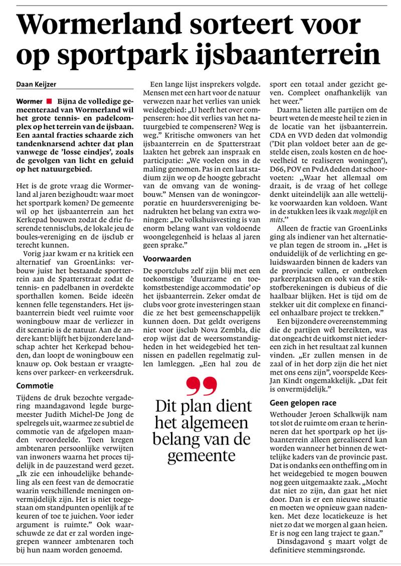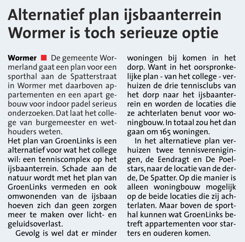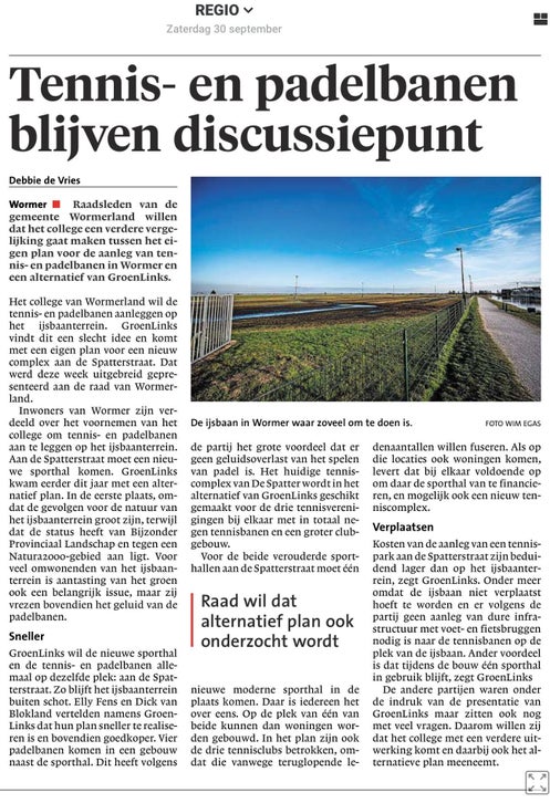 In de voorrondes van afgelopen dinsdag kwamen een aantal belangrijke zaken aan de orde in de voorrondes van de gemeenteraad van Wormerland. De meeste belangstelling ging uit naar de voorstellen rond de verhuizing van de gefuseerde tennisverenigingen naar het IJsbaanterrein. Een weg die al vroeg door het college is ingezet, pas veel later in het proces is het alternatief van een nieuw sportcomplex op de Spatterstraat vanuit Groen Links op tafel gekomen.