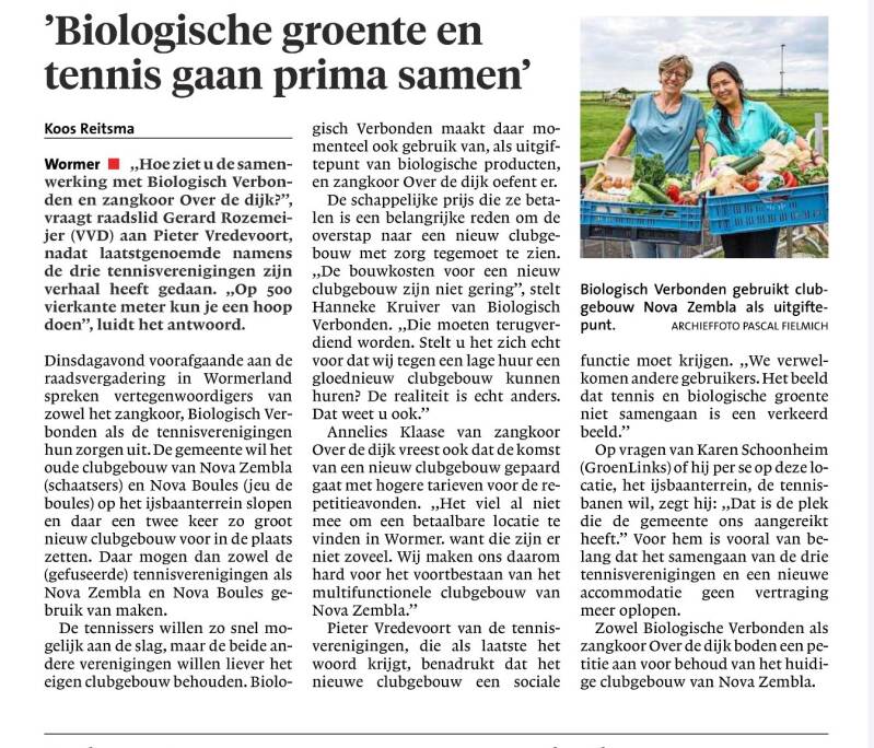 Tijdens de raadsvergadering van 15 maart 2023 waren vertegenwoordigers van alle drie onderstaande partijen aanwezig maakten zij gebruik van hun spreekrecht. Ook boden Biologisch Verbonden en Dameskoor Over de Dijk een petitie aan voor het behoud van het huidige clubgebouw NOVA ZEMBLA.